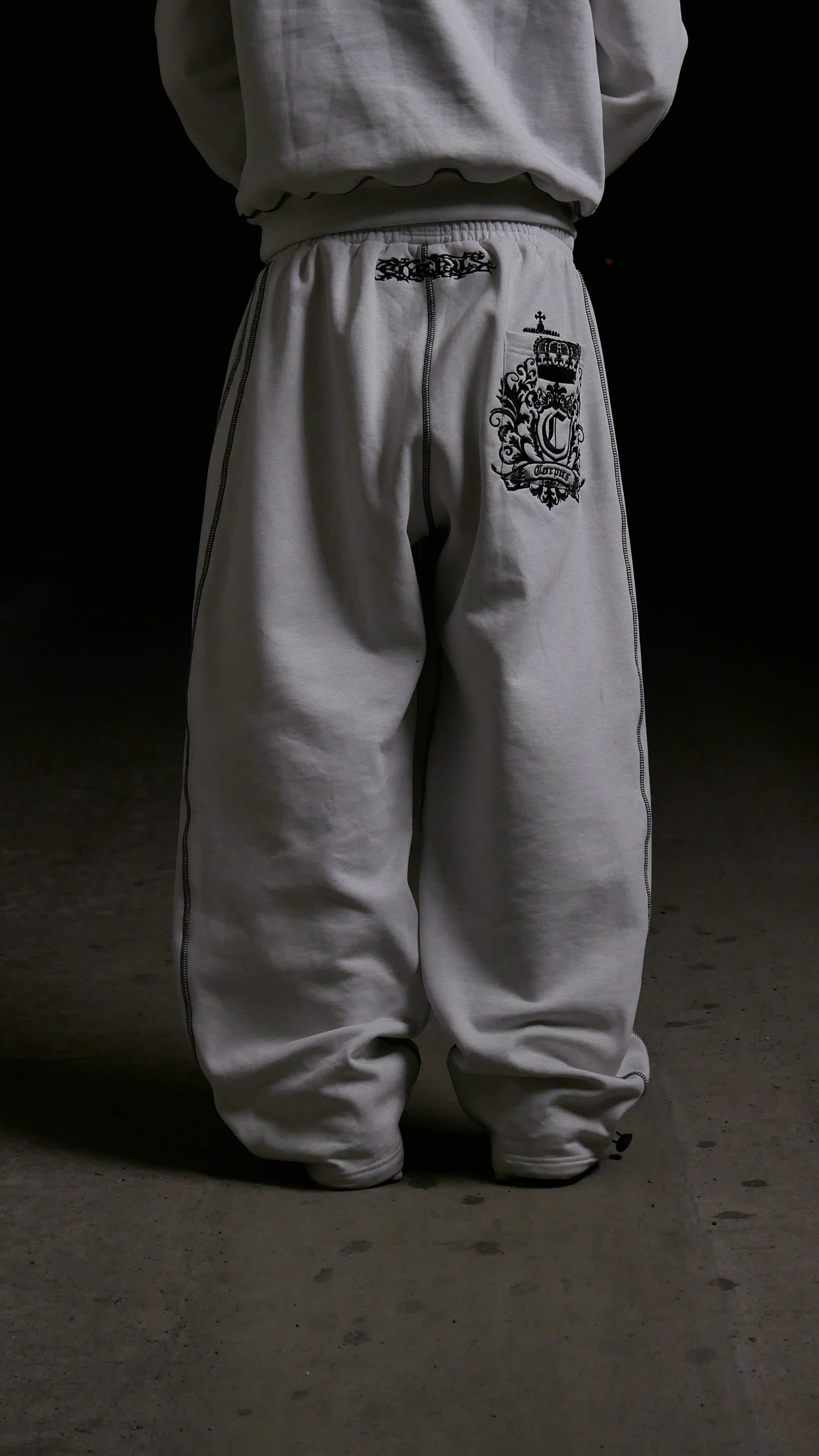 Ce jogging est disponible uniquement en précommande pour certaines tailles actuellement en rupture de stock. Il est fabriqué dans un tissu gris épais (500 GSM), doux, résistant et confortable. Sa coupe droite et légèrement ample apporte un tombé fluide, et la taille élastique avec cordon intégré permet un ajustement facile. Les chevilles disposent également d’un cordon pour resserrer ou laisser ouvert selon le style souhaité. Une broderie noire habille la poche arrière, complétée par des coutures contrastantes le long des jambes.